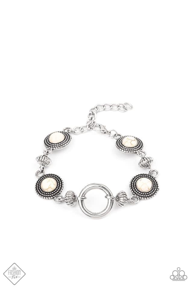 Featuring an airy silver hoop centerpiece, a rustic collection of silver beads and silver discs dotted in white stones delicately link around the wrist for a seasonal look. Features an adjustable clasp closure.