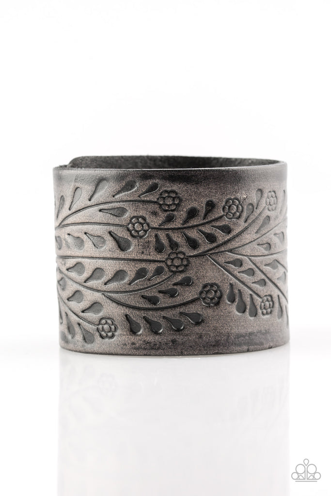 Stamped in a leafy floral pattern, a thick leather band wraps around the wrist for a bold seasonal look. Features an adjustable snap closure.