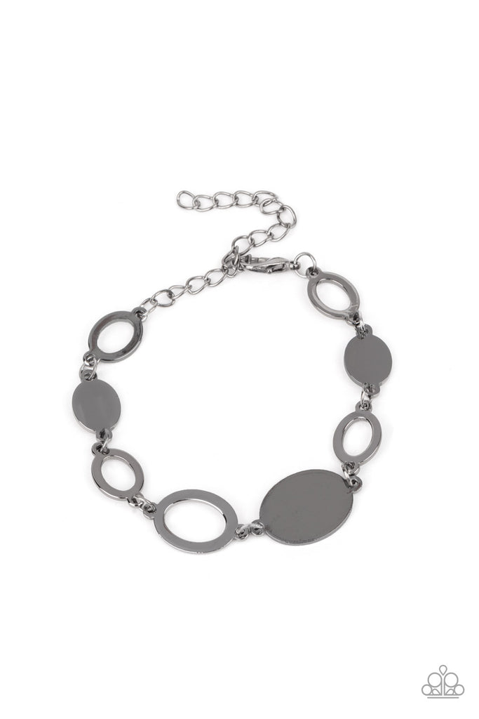 A shiny series of glistening gunmetal discs and oval frames delicately link around the wrist, creating a casual statement. Features an adjustable clasp closure.