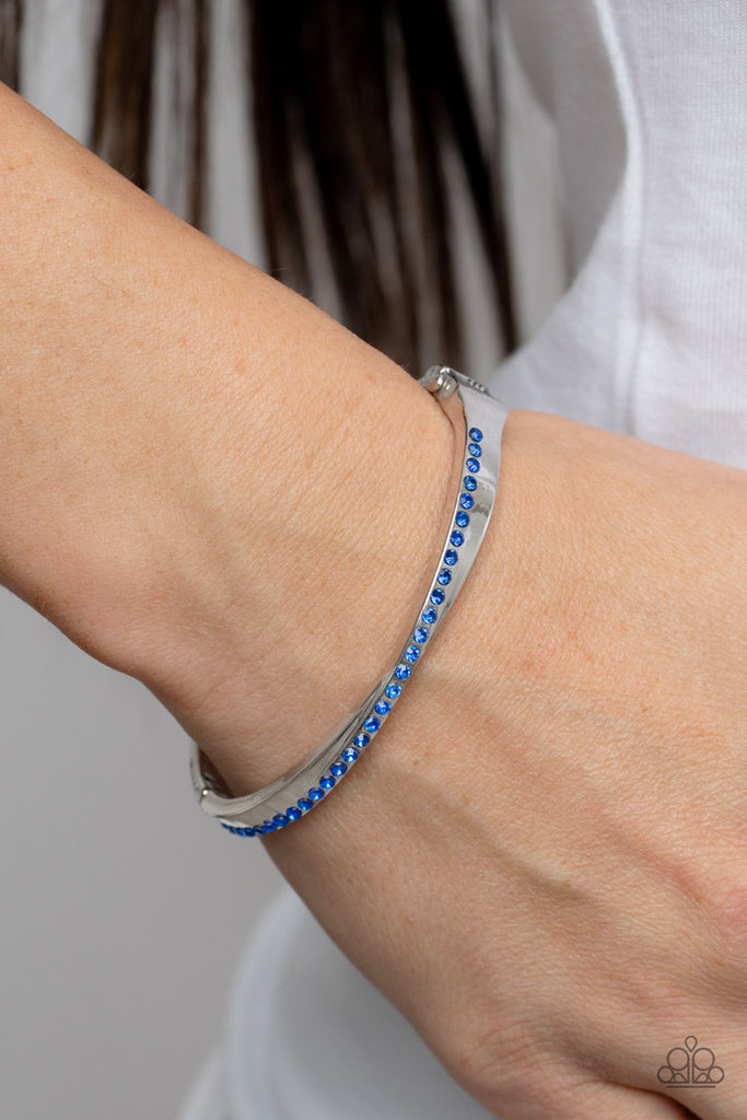 A dainty row of glittery blue rhinestones slants across an asymmetrical silver frame that curls around the wrist, resulting in a timeless bangle-like bracelet. Features a hinged closure.