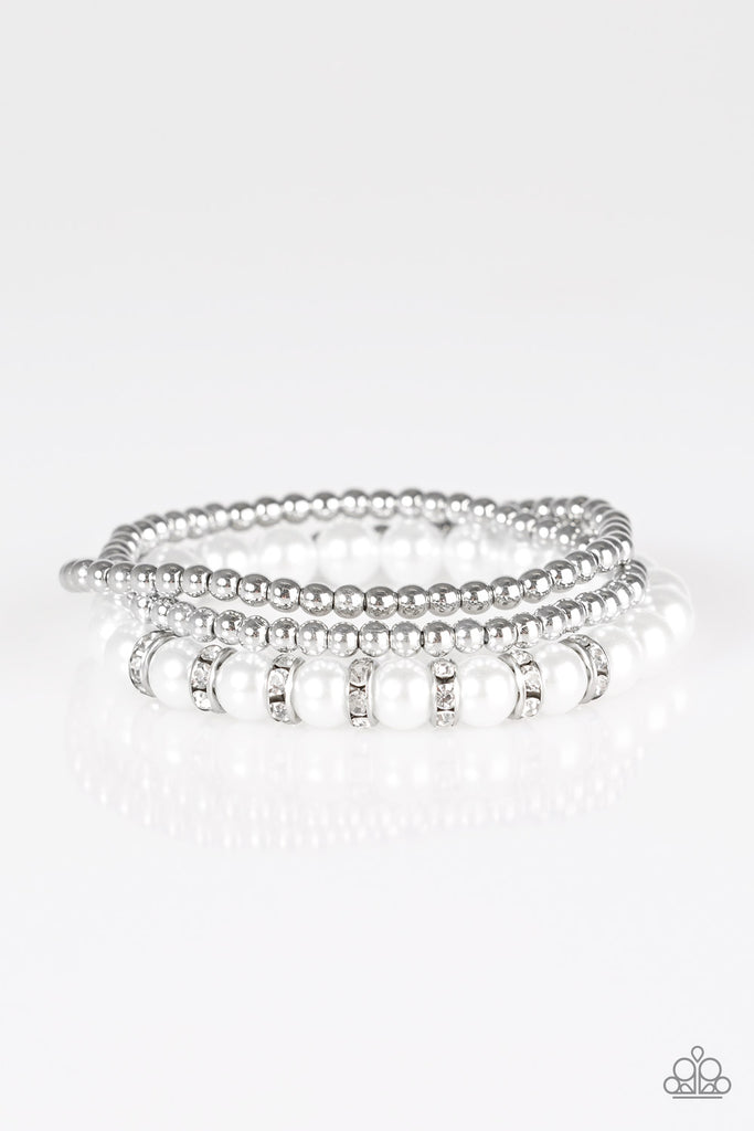 Infused with two strands of classic silver beading, pearly white beads are threaded along an elastic stretchy band. Rhinestone encrusted rings are sprinkled between the pearl accents for a refined finish.