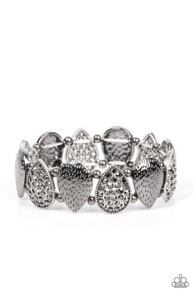 Infused with pairs of gunmetal beads, a decorative collection of hammered gunmetal teardrops, and hematite encrusted silver teardrops alternate along stretchy bands around the wrist for an edgy flair.