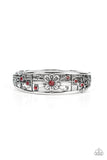 Slanted trios of dazzling red rhinestones flank a whimsical red rhinestone dotted floral center, resulting in an airily layered bangle-like bracelet around the wrist. Features a hinged closure.