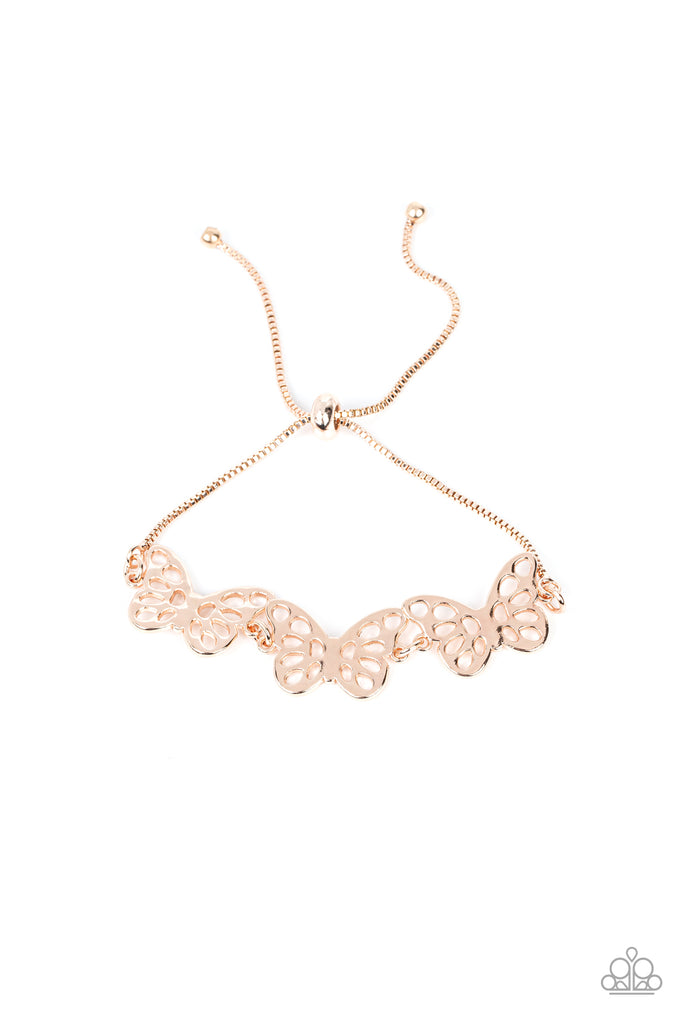 Featuring airy stenciled cutouts, three rose gold butterflies delicately connect at the center of a rose gold box chain for a whimsical fashion. Features an adjustable sliding bead closure.