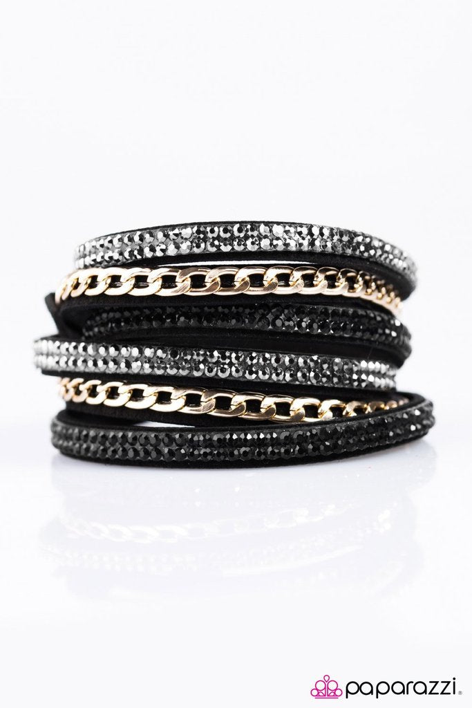Three strands of black suede are embellished with gold chain and glittery hematite rhinestones, creating a sassy display. The elongated band allows for a trendy double wrap design. Features an adjustable snap closure.