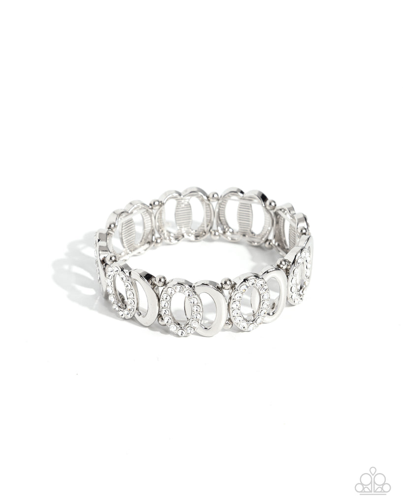 A collection of two interlocking silver ovals, one encrusted in white rhinestones, separated by a duo of silver beads wraps along the wrist on elastic stretchy bands for a timeless, twisted look.