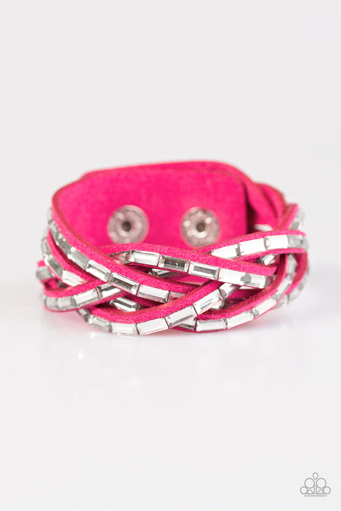 Featuring edgy emerald style cuts, glittery white gems are encrusted across crisscrossing strands of pink suede, creating a rock star shimmer. Features an adjustable snap closure.