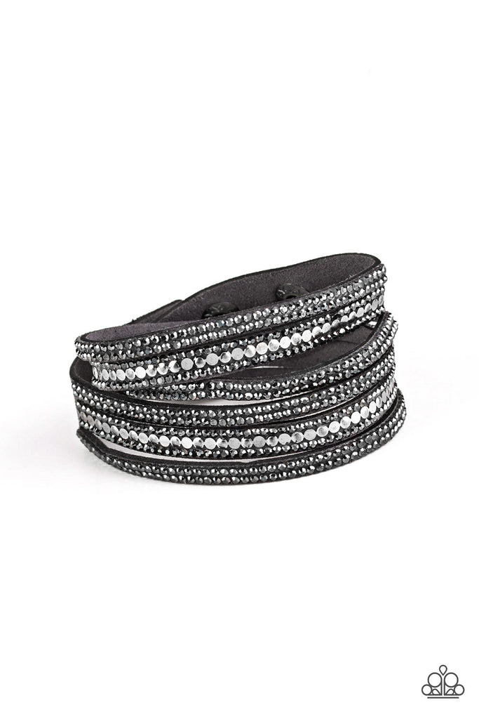 Encrusted in rows of glittery hematite rhinestones and flat gunmetal and silver studs, three strands of gray suede wrap around the wrist for a sassy look. The elongated band allows for a trendy double wrap around the wrist. Features an adjustable snap closure.
