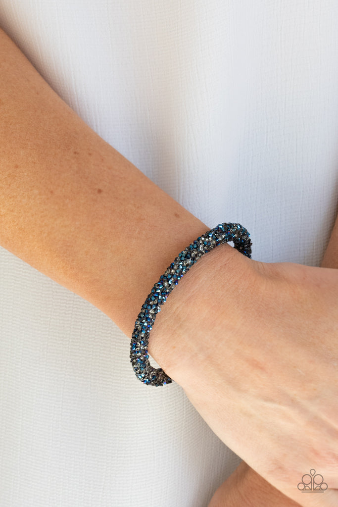 As if rolled in glitter, a seemingly infinite collection of metallic blue and smoky rhinestones adorns a flexible band that delicately coils around the wrist for a sparkly versatile fit.