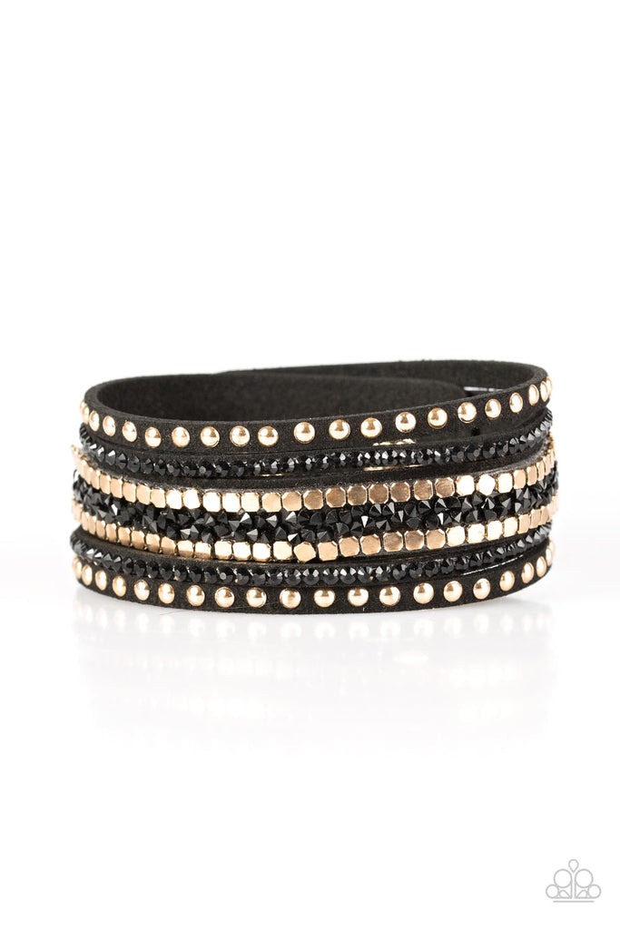 Shiny gold studs and glistening gold cube beading are encrusted along strands of black suede for a sassy look. Black rhinestones and glittery black prisms are sprinkled along the layers for a fierce finish. Features an adjustable snap closure.