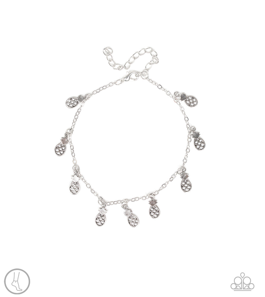 Dainty silver pineapple charms dangle from the ankle for a summery flair. Features an adjustable clasp closure.
