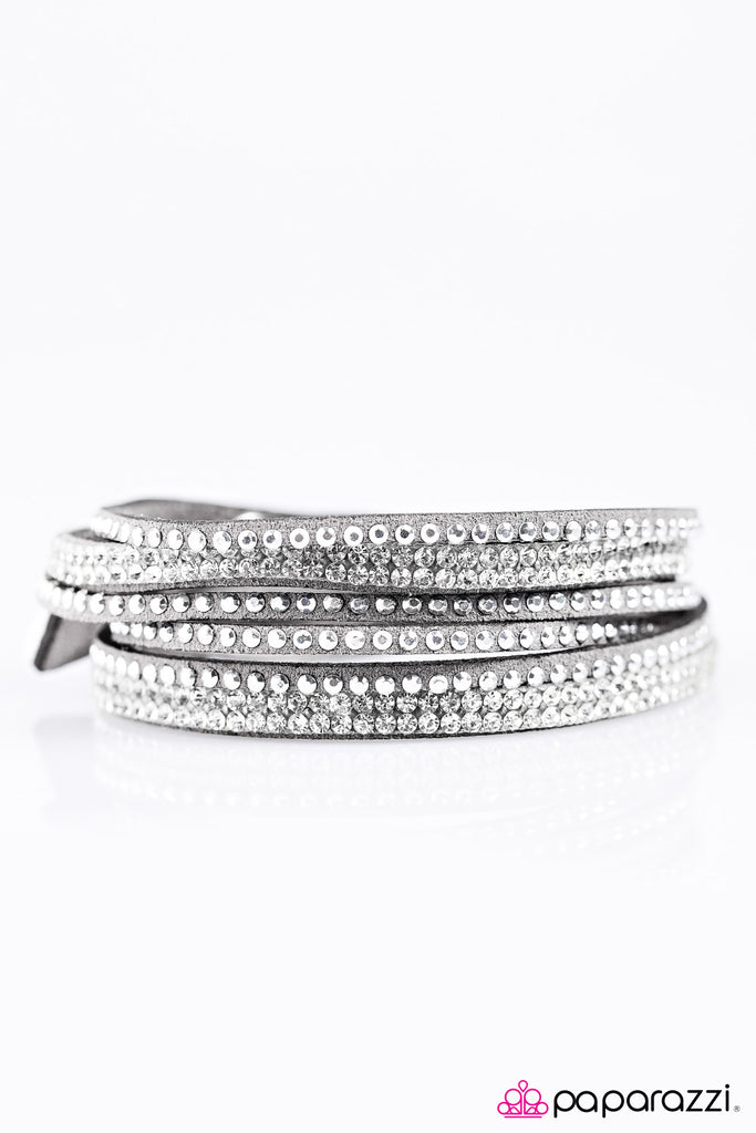 A skinny strip of gray suede is spliced into three glittery strands. Stacked rows of glittery white rhinestones are flanked by faceted silver studs, creating a sparkling mishmash of sassy texture. The elongated design allows for a trendy double wrap around the wrist. Features an adjustable snap closure.