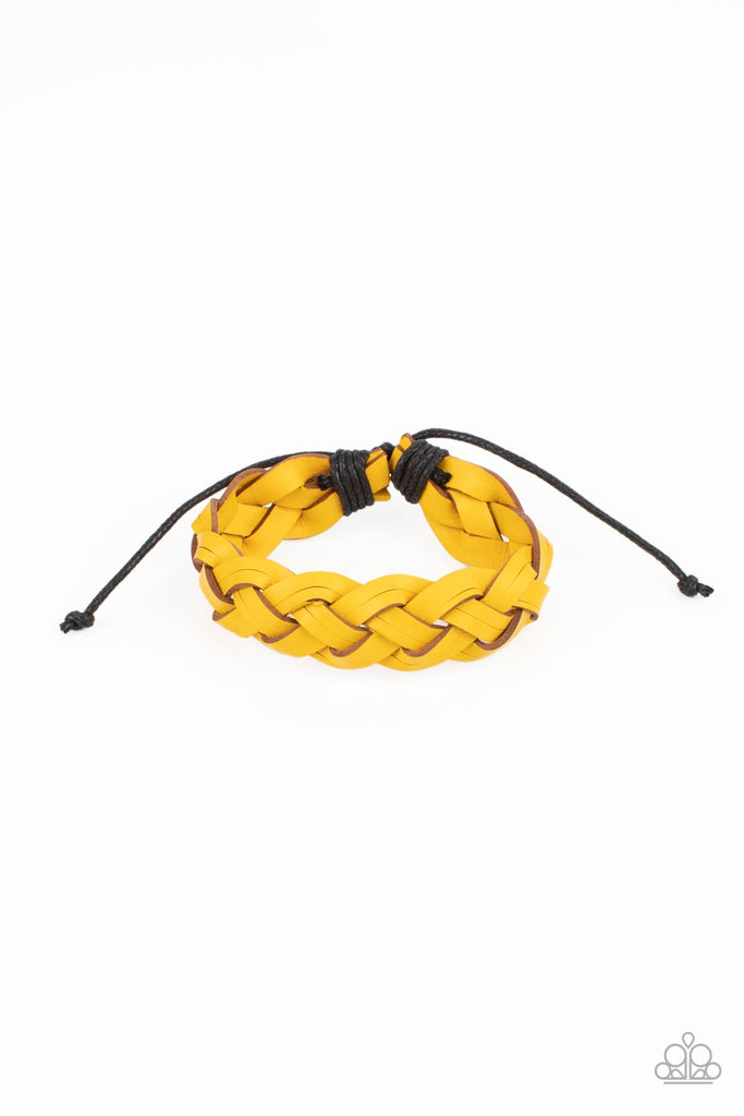 Strappy strands of yellow leather are braided together for a trendy seasonal fashion around the wrist. Features an adjustable sliding knot closure.
