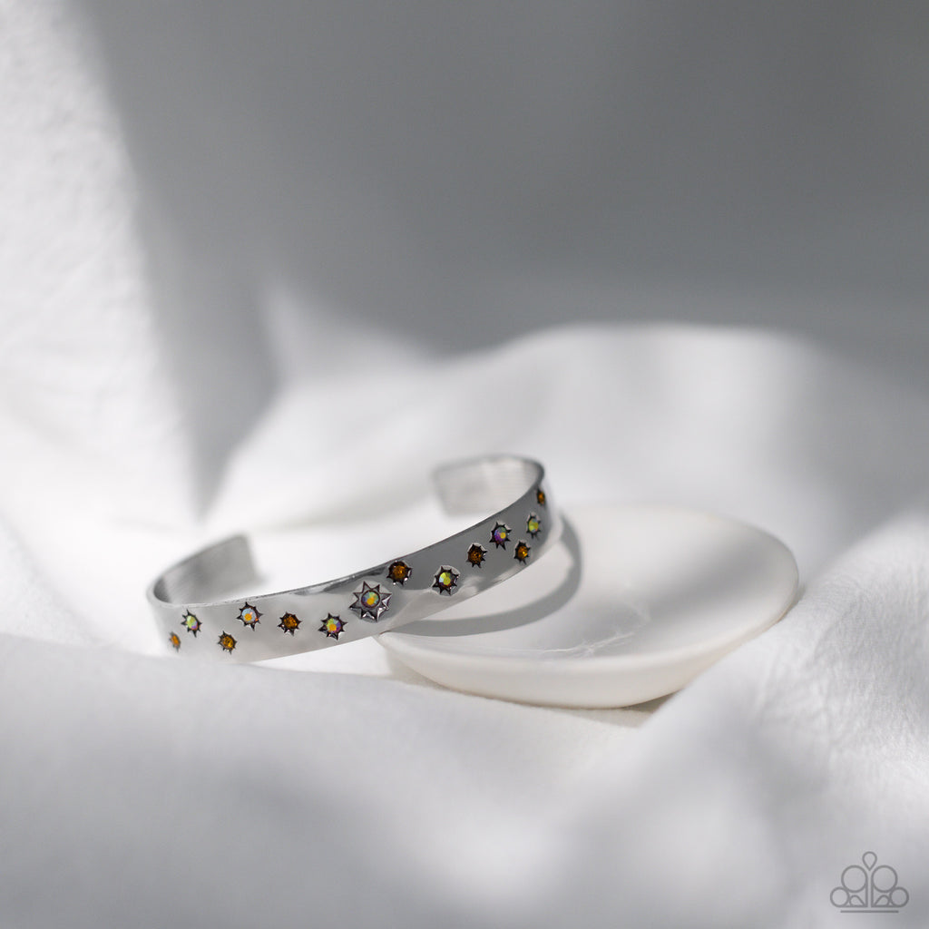 Tinted in subtle, stellar shades of orange and iridescence, dainty rhinestones are pressed into the centers of stamped stars in varying sizes. Embossed in tactile textures, the starry collection wraps around the wrist against a backdrop of a high-sheen silver cuff, emitting further glow to the design. Due to its prismatic palette, color may vary.