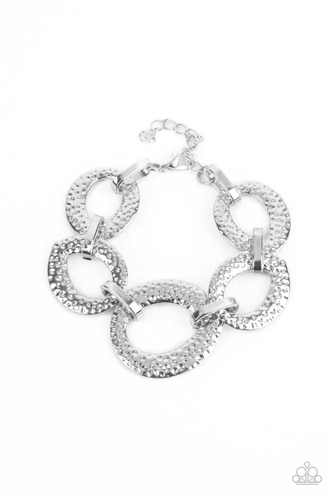 Asymmetrical silver links and hammered oval frames delicately connect around the wrist for an intense industrial look. Features an adjustable clasp closure.