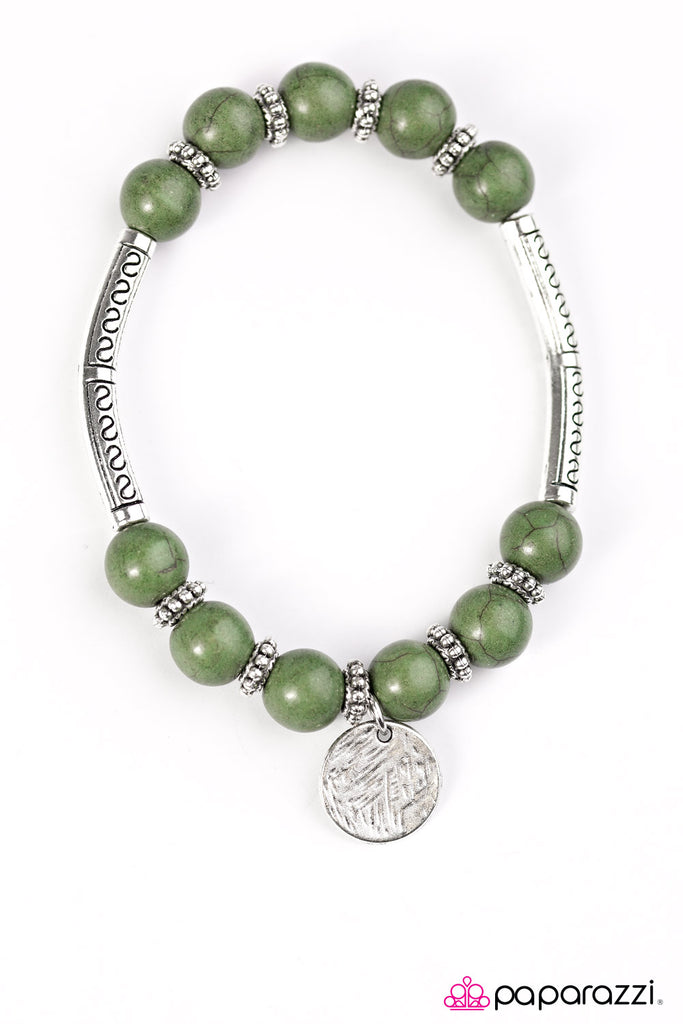 Green stone beading is threaded along an elastic stretchy band, creating an earthy palette. Infused with tribal inspired silver accents, a shimmery silver disc swings from the wrist for a handcrafted finish.