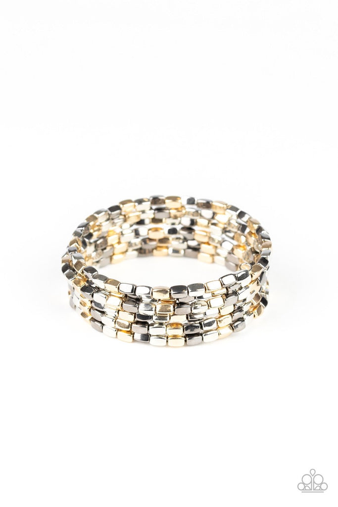 A glistening collection of rectangular gold, gunmetal, and silver beads are threaded along a coiled wire, creating a shimmery infinity wrap style bracelet around the wrist.
