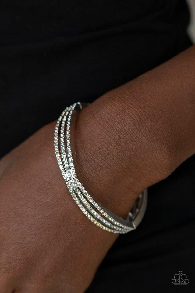 Sporadically dotted in rows of iridescent rhinestones and shiny silver studs, stacked silver frames are threaded along a stretchy band around the wrist for a refined look.