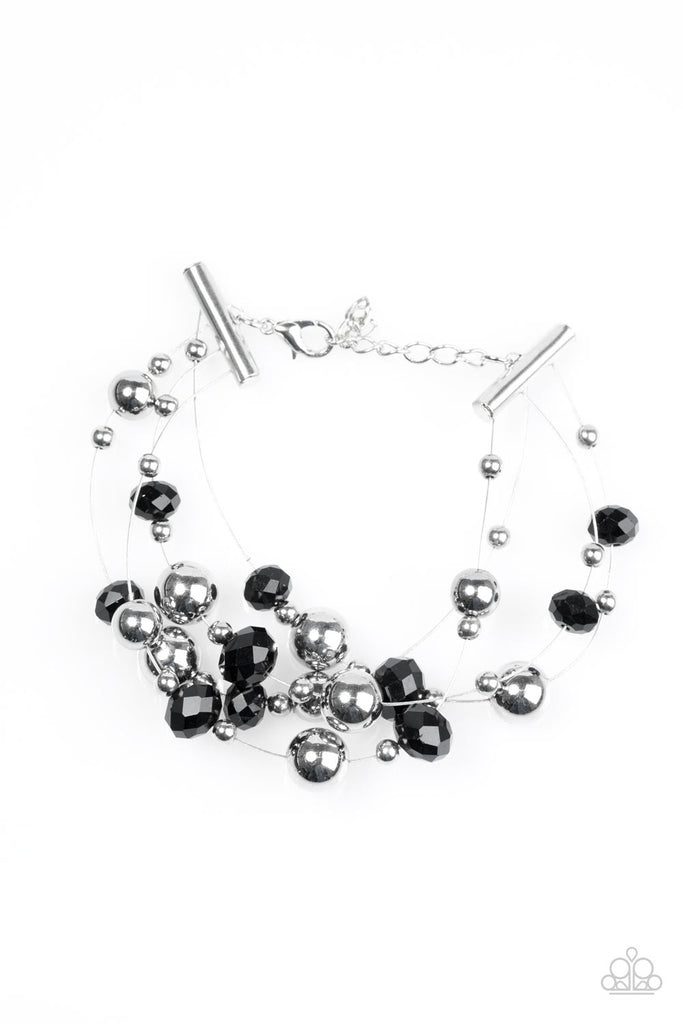 Glittery black crystal-like and glistening silver beads are threaded along shimmery wires, creating floating layers across the wrist. Features an adjustable clasp closure.