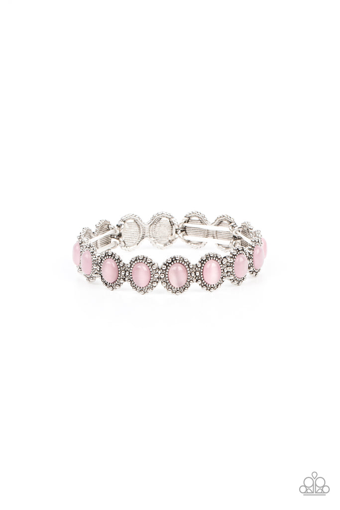 Bordered in dainty silver studs, pairs of pink cat's eye stones are threaded along stretchy bands around the wrist for a dreamy fashion.
