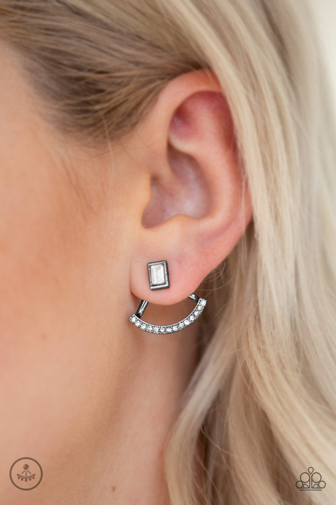 A solitaire emerald-cut rhinestone attaches to a double-sided post, designed to fasten behind the ear. Radiating with a bowing row of white rhinestones, the double sided-post peeks out beneath the ear for an edgy look. Earring attaches to a standard post fitting.