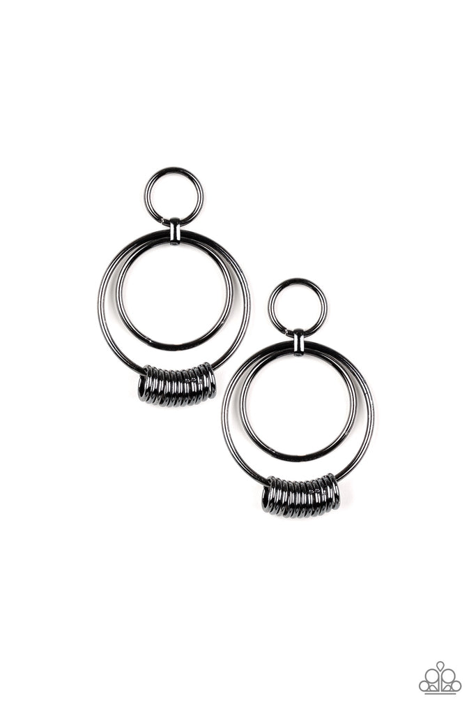 Dainty gunmetal rings slide along the bottom of a double hoop lure for a bold industrial look. Earring attaches to a standard post fitting.