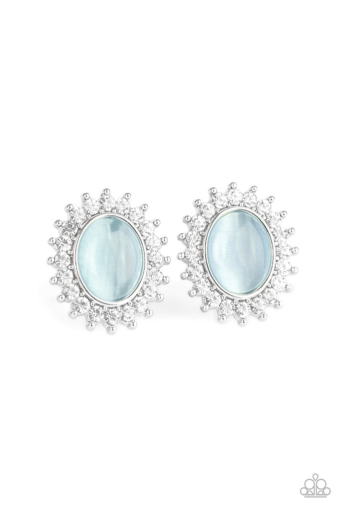 Dazzling white rhinestones spin around a glowing a blue moonstone for a dazzling look. Features a standard post fitting.