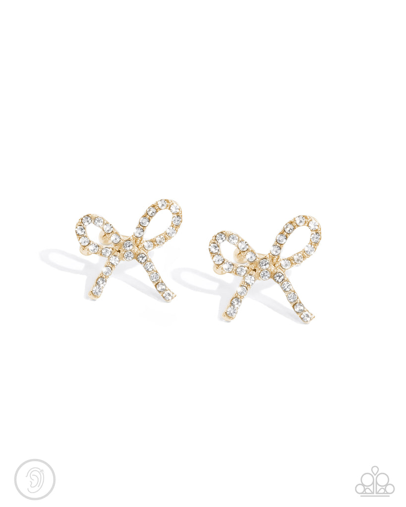 Embellished in glistening white rhinestones, a loopy curly bow of gold is embellished along an adjustable, one-size-fits-all gold cuff for a refined look. Dainty gold balls are affixed to the ends of the hoop, reminiscent of a barbell fitting for a glistening finish.