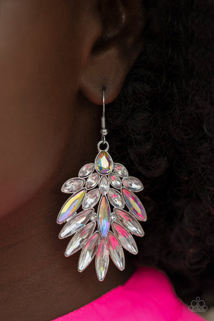 An iridescent teardrop rhinestone gives way to a sparkly fan of classic white and oblong iridescent marquise cut rhinestones, coalescing into an out-of-this-world statement piece. Earring attaches to a standard fishhook fitting.