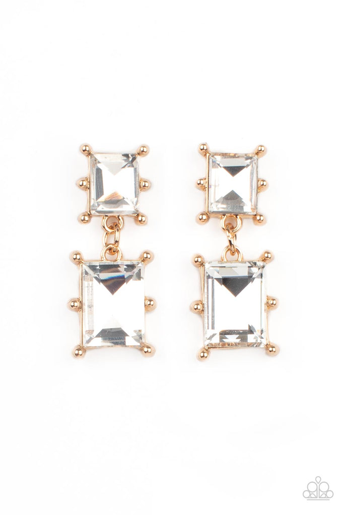 Two brilliant baguette cut white rhinestones, set in classic shiny gold pronged settings, stack one over the other creating a cosmically radiant statement. Earring attaches to a standard post fitting.