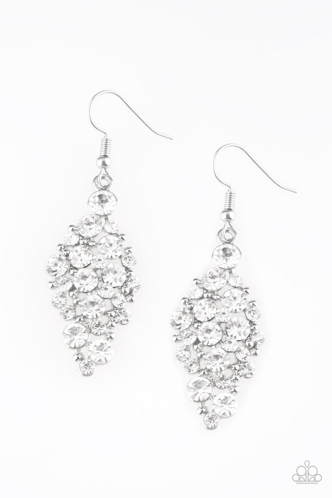 Varying in size, glittery white rhinestones and dainty silver studs coalesce into a sparkling diamond-shaped frame for a regal look. Earring attaches to a standard fishhook fitting.