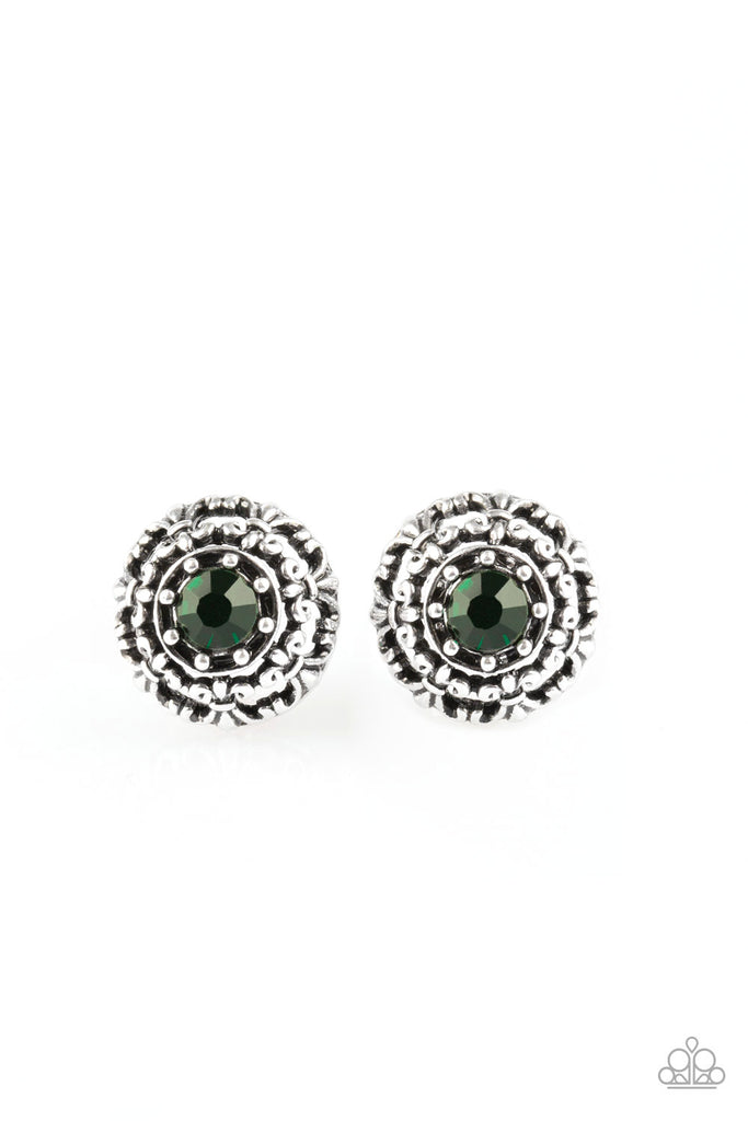A glittery green rhinestone dots the center of a shimmery silver frame swirling with regal filigree detail for a refined look. Earring attaches to a standard post fitting.