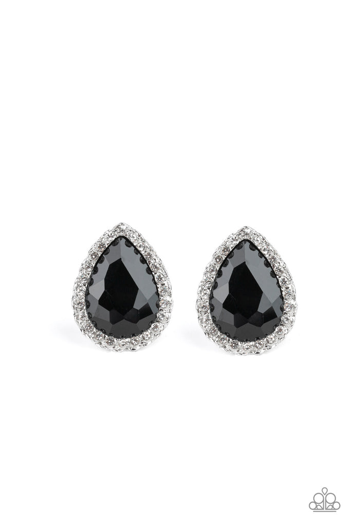 Encrusted in a ring of glittery white rhinestones, an overly dramatic black teardrop gem is pressed into a textured silver frame for a glamorous look. Earring attaches to a standard post fitting.