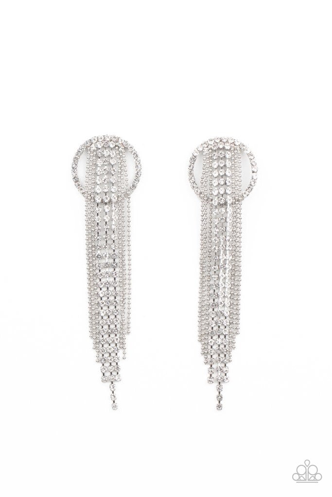Dainty strands of glassy white rhinestones and shimmery silver ball-chain stream from the top of a bedazzled white rhinestone hoop, creating a dazzling fringe. Earring attaches to a standard post fitting.