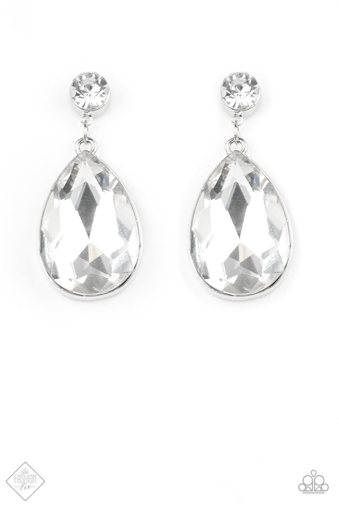 An exaggerated teardrop-shaped rhinestone swings from the bottom of a classic white rhinestone, creating a dramatically glamorous lure. Earring attaches to a standard post fitting.