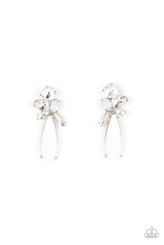 Featuring various cuts, a glitzy collection of white and opal rhinestones delicately cluster into a sparkly fitting. Featuring a glittery white lacquer backdrop, an acrylic teardrop swings from the bottom of the effervescent frame for an ethereal finish. Earring attaches to a standard post fitting.