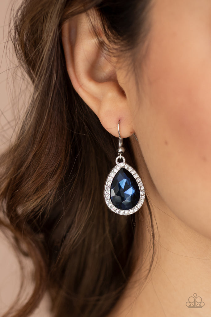 A blue teardrop gem is pressed into the center of a silver teardrop frame encrusted in glassy white rhinestones, creating dramatic sparkle. Earring attaches to a standard fishhook fitting.