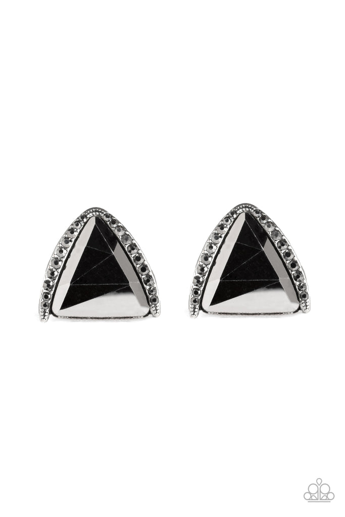 Featuring a regal triangular cut, an oversized hematite gem is nestled in an angled silver frame radiating with dainty hematite rhinestones for a glamorous look. Earring attaches to a standard post fitting.