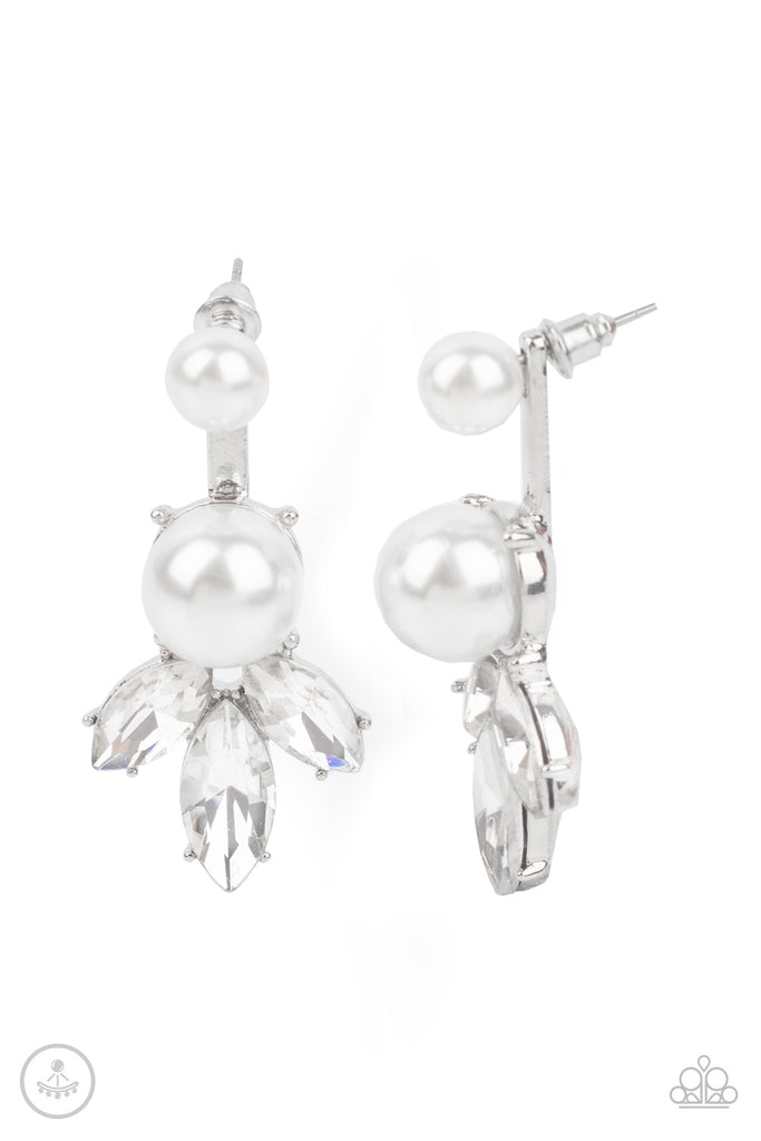 A solitaire white pearl attaches to a double-sided post, designed to fasten behind the ear. Infused with an oversized pearl and white rhinestone fringe, the double sided-post peeks out beneath the ear for a glamorous finish. Earring attaches to a standard post fitting.
