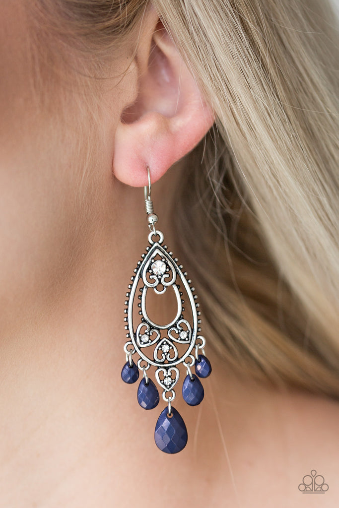 Radiating with white rhinestone centers, shimmery silver heart frames climb a silver teardrop, creating a whimsical lure. Faceted blue teardrops swing from the bottom, adding a flirty fringe to the playful palette. Earring attaches to a standard fishhook fitting.