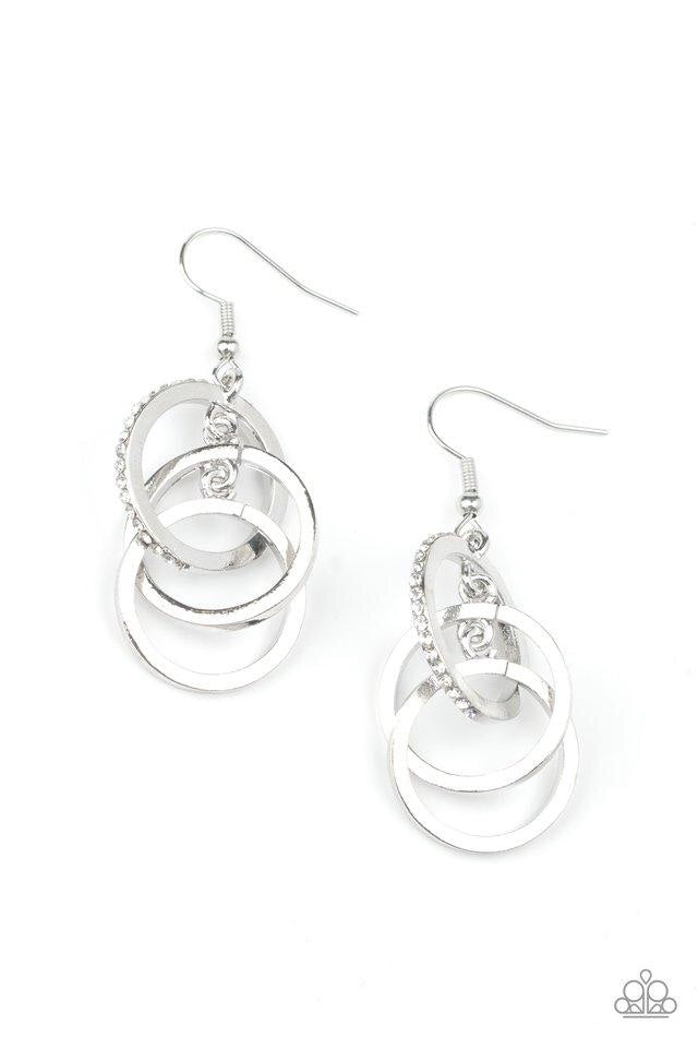 A white rhinestone encrusted silver ring and pair of shiny silver rings are threaded along a shiny silver fitting, creating a fierce lure. Earring attaches to a standard fishhook fitting.