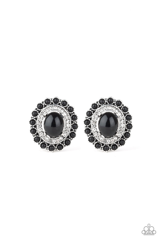 A shiny black bead dots the center of a frilly flower frame radiating with a ring of glassy white rhinestones for a colorful refinement. Earring attaches to a standard post fitting.