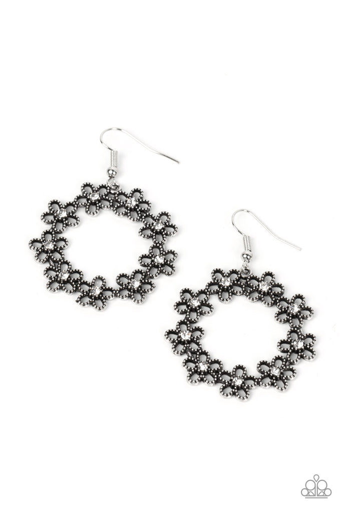 Dotted with dainty white rhinestone centers, studded silver flowers delicately connect into a whimsical floral wreath for a seasonal fashion. Earring attaches to a standard fishhook fitting.