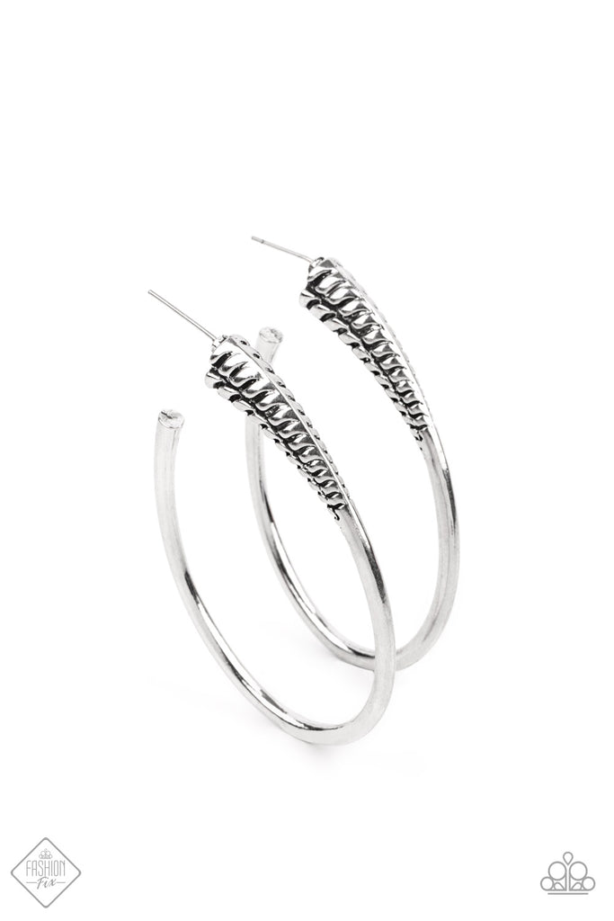 A spiral of texture resembling a coil anchors an exaggerated oblong silver hoop that wraps around the ear. The high-sheen finish on the curved bar adds a hint of drama, as it refracts the light in a knockout finish. Earring attaches to a standard post fitting. Hoop measures approximately 1 1/2" in diameter.