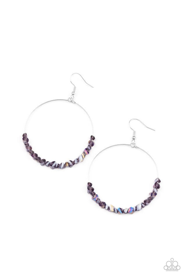 Featuring an iridescent shimmer, jagged bits of glassy purple rocks are threaded along the bottom of a dainty silver hoop for a colorful look. Earring attaches to a standard fishhook fitting.