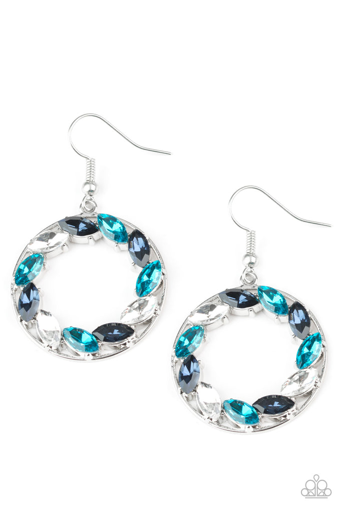 Featuring regal marquise style cuts, glittery white, light blue, and dark blue rhinestones are encrusted along a shimmery silver hoop for a radiant fashion. Earring attaches to a standard fishhook fitting.