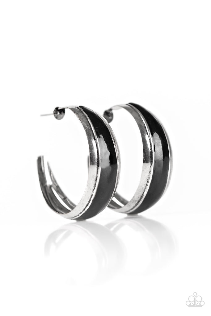 A chunky silver hoop curls around the ear in a bohemian inspired fashion. The perfectly distressed silver finish is complemented by a strip of black paint that adorns the center of the hoop for a playful pop of color. Earring attaches to a standard post fitting. Hoop measures 1 5/8” in diameter.