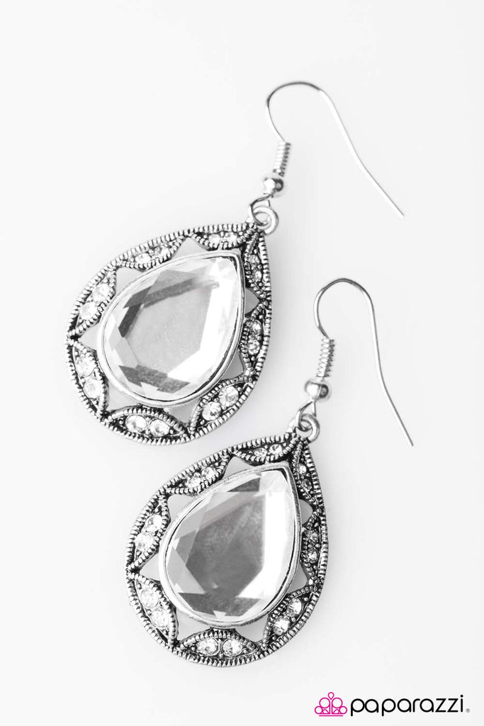 A glittery faceted gem is nestled in a decorative silver frame sprinkled with dazzling white rhinestones. Infused with a radiant pattern, the refined display falls from the ear in a regal fashion. Earring attaches to standard fishhook fitting.