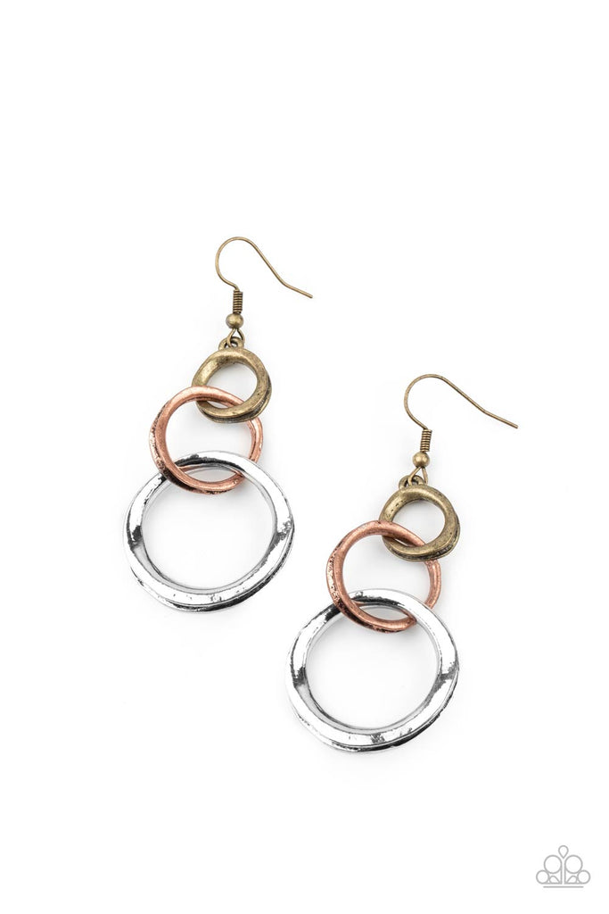 Featuring an antiqued beveled center, warped brass, copper, and silver rings asymmetrically connect into a rustic lure. Earring attaches to a standard fishhook fitting.