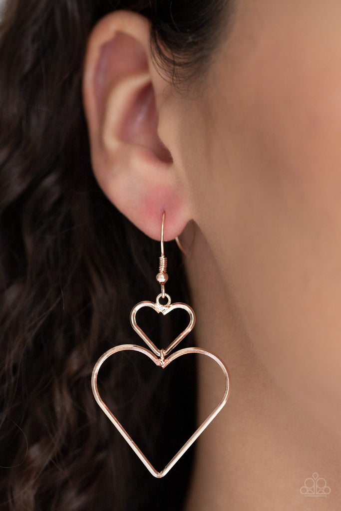 A large rose gold heart silhouette swings from the bottom of a dainty rose gold heart silhouette, creating a charming lure. Earring attaches to a standard fishhook fitting.